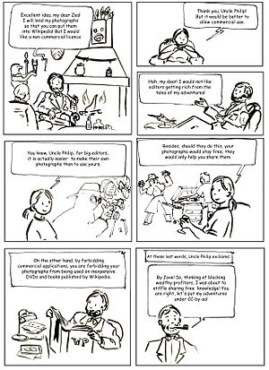 This cartoon explains why Commons does not accept "noncommercial" licenses. Click to view the full-size image.